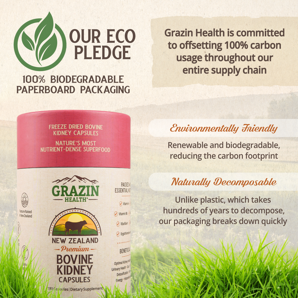 Made in small batches in the USA without GMOs, fillers, or flow agents and third party verified for purity, our supplements for kidney health are sourced from 100% grass fed cows, pasture-raised without hormones in lush fields.