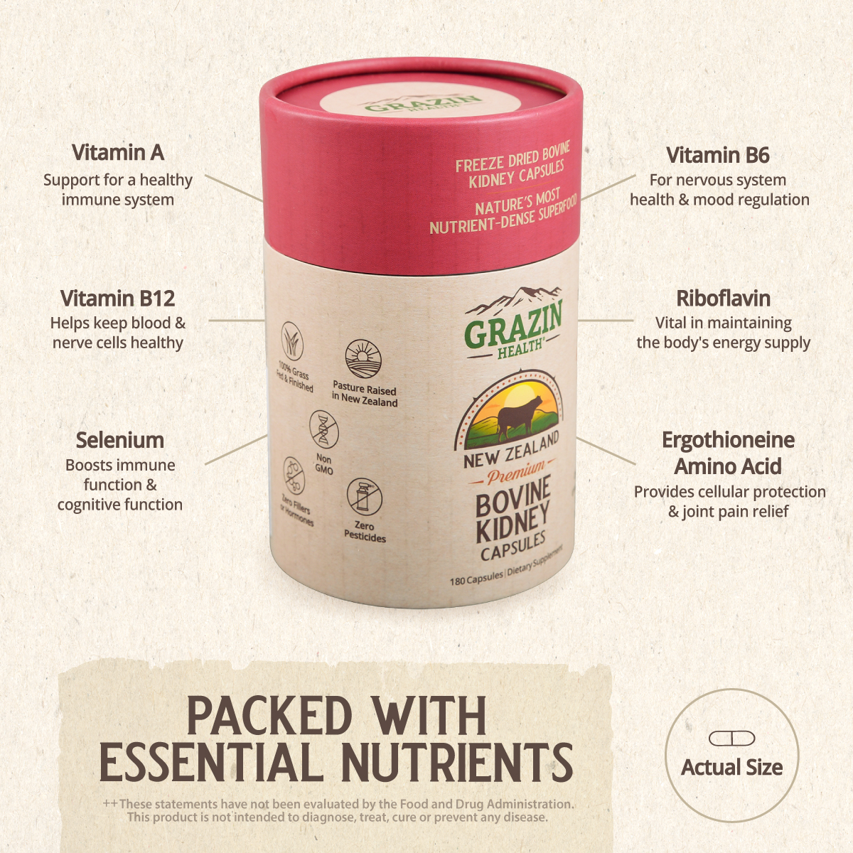 Kidney is a staple superfood of the carnivore lifestyle and a potent source of naturally occurring nutrients like Vitamin B-12, proteins, peptides, and enzymes. Bovine is one of the most highly regarded meat sources that is obtained in select food markets. A nutritional supplement can also provide all the health benefits of this animal-based superfood for daily support.